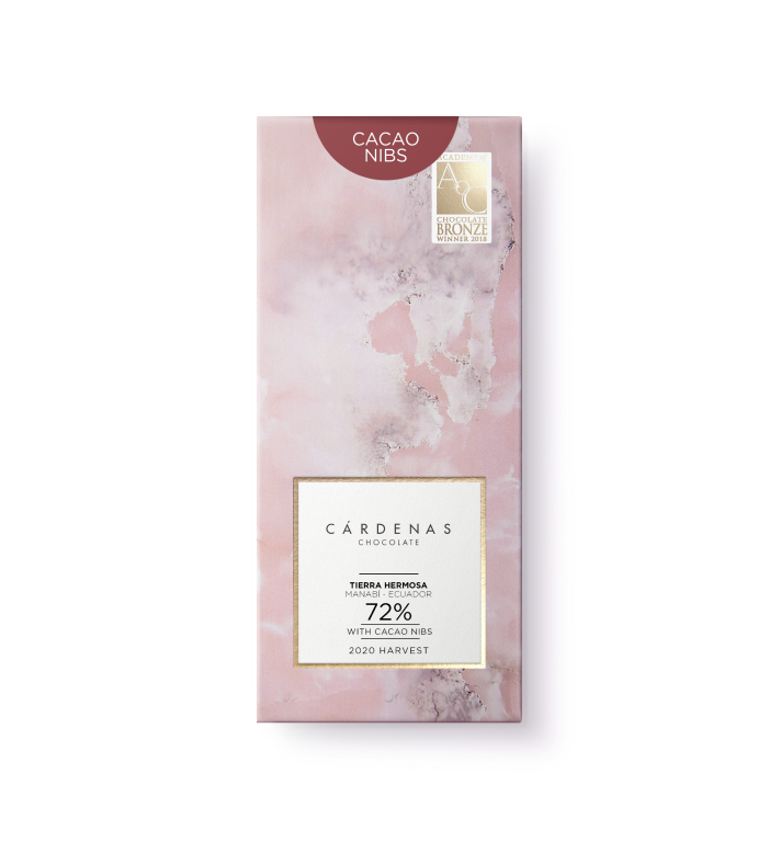 London Academy of Chocolate Award Winner 2018. Enjoy the sophisticated floral, fruity, nutty and caramel nuances of the Arriba Nacional cacao. Intoxicating dark chocolate named “Tierra Hermosa” (Beautiful Land) after its origin Manabí, Ecuador; it’s our signature chocolate. In addition to its unique flavour, this chocolate has many symbols: it evokes heritage, femininity, delicacy, resilience, provenance. You will adore the intensity of the cacao nibs!